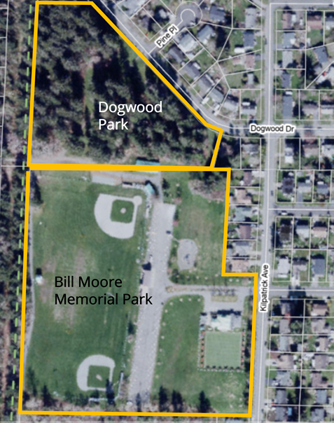 Bill Moore Park is a 5.66‑hectare community park located in West Courtenay that serves as a major hub for local sports, recreation, and community use. Adjacent to Bill Moore Memorial Park, Dogwood Park is a 2.32‑hectare nature park featuring mature forested areas and natural habitat.